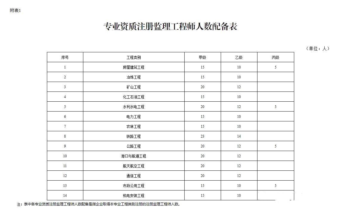 (3)相应专业的注册监理工程师不少于《专业资质注册监理工程师人数配备表》(附表1)中要求配备的人数。