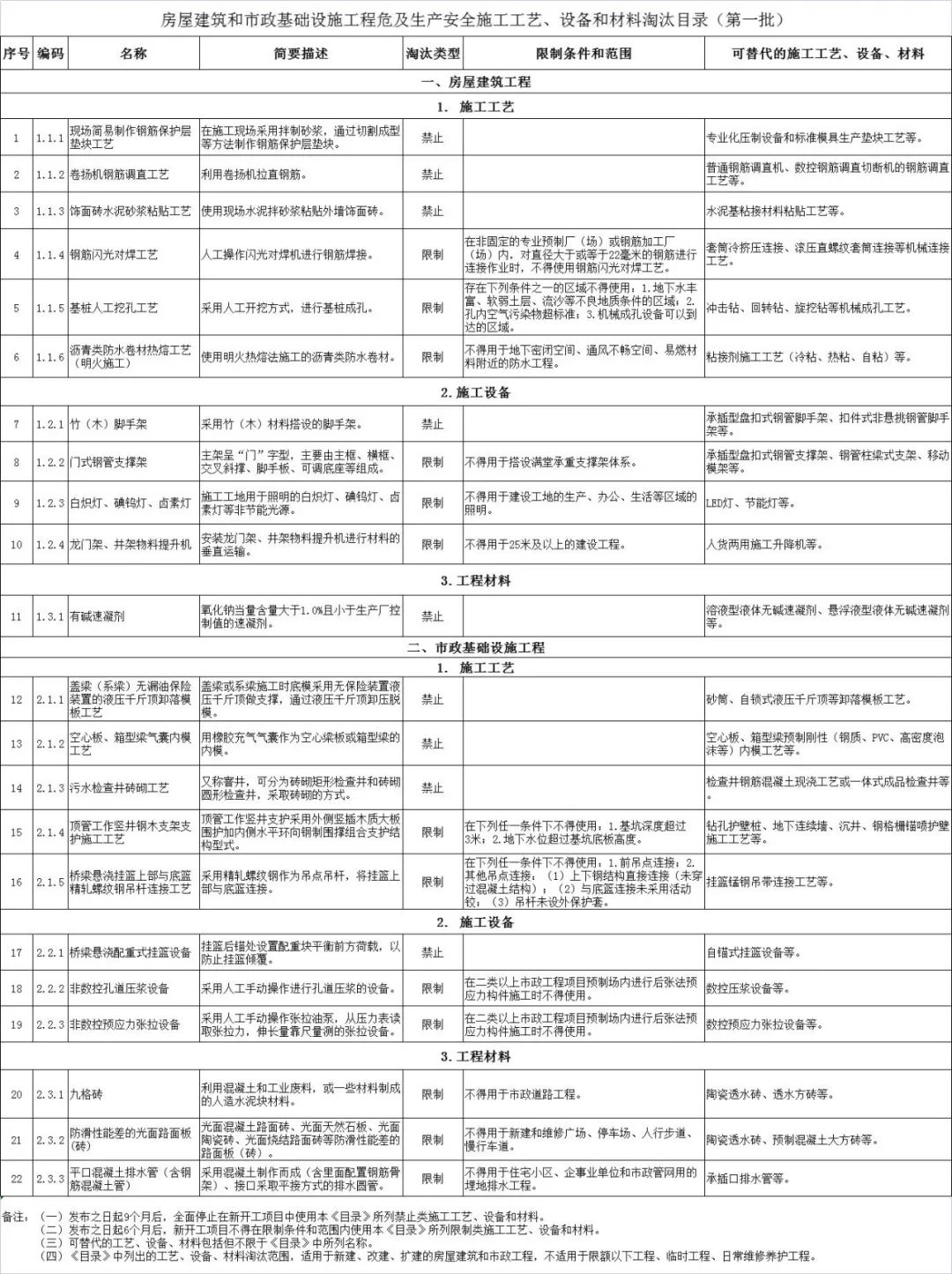 2021年12月14日,住建部印发的《房屋建筑和市政基础设施工程危及生产安全施工工艺、设备和材料淘汰目录(第一批)》明确: