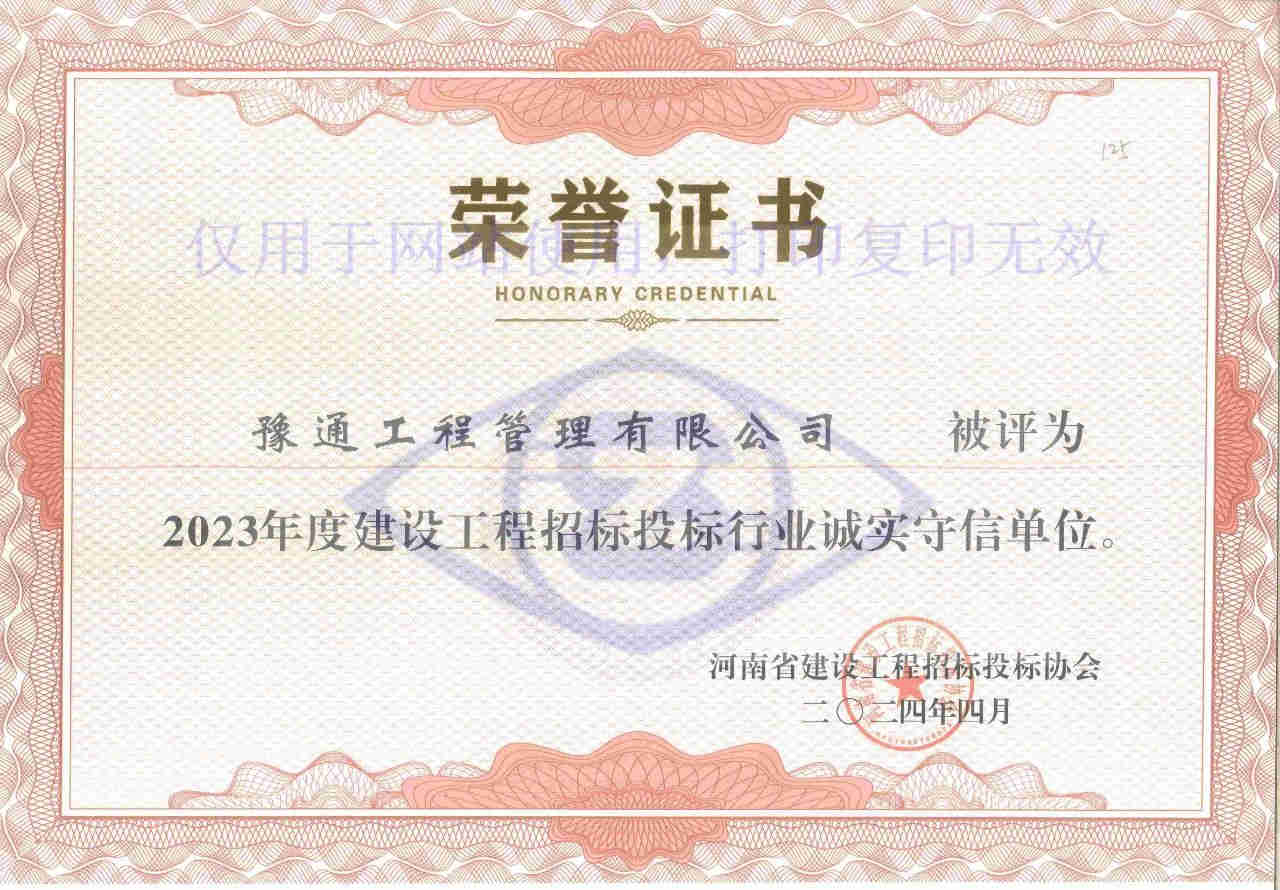 近日,河南省建设工程招标投标协会发布了《关于公布2023年度建设工程招标投标行业诚实守信单位的通知》(豫建招协字〔2024〕11号),我公司荣获“2023年度建设工程招标投标行业诚实守信单位”荣誉称号。