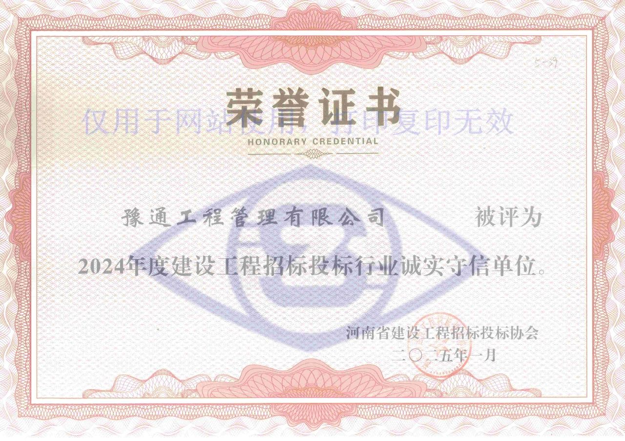 近日,河南省建设工程招标投标协会发布《关于公布2024年度建设工程招标投标行业诚实守信单位的通知》,我公司凭借良好的信誉,成功获评“2024年度建设工程招标投标行业诚实守信单位”荣誉称号。