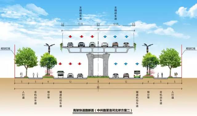 我公司中标为二标段:陇海铁路桥桥南—王城大桥南,长5.12公里。高架主线为双向6车道,设计时速为80km/h,地面为双向6车道,设计时速为60km/h。标段内含王城大道与纱厂西路互通式立交,沿纱厂西路和解放路向洛阳火车站方向设置高架桥;王城大道与九都路菱形互通式立交,其中九都路下穿王城大道隧道;局部设置简易式上下匝道桥。